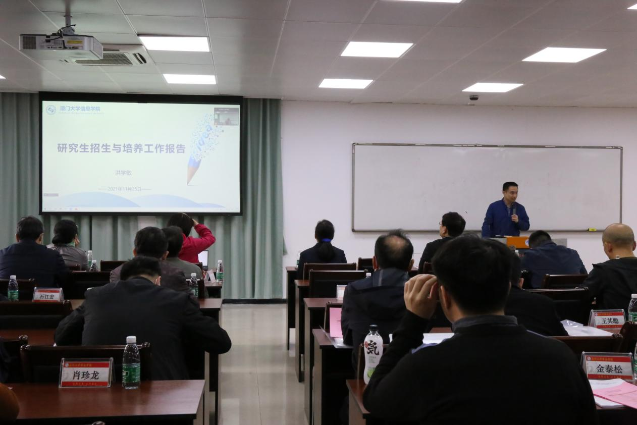 为了深入贯彻落实党的十九届六中全会精神,全面贯彻习近平总书记对研究生教育工作的重要指示,强化导师岗位培训,深化研究生培养模式改革,11月25日,信息学院于海韵园行政楼A201召开“师德师风教育周”专题工作会议——研究生培养工作会,会议采取线上线下形式同步进行。厦门大学学生部副部长陈泗林、研究生院学位与学科建设办公室副主任范丽娟、学院党政领导、系所平台负责人及全院研究生导师出席。会议由学院副院长洪学敏主持。