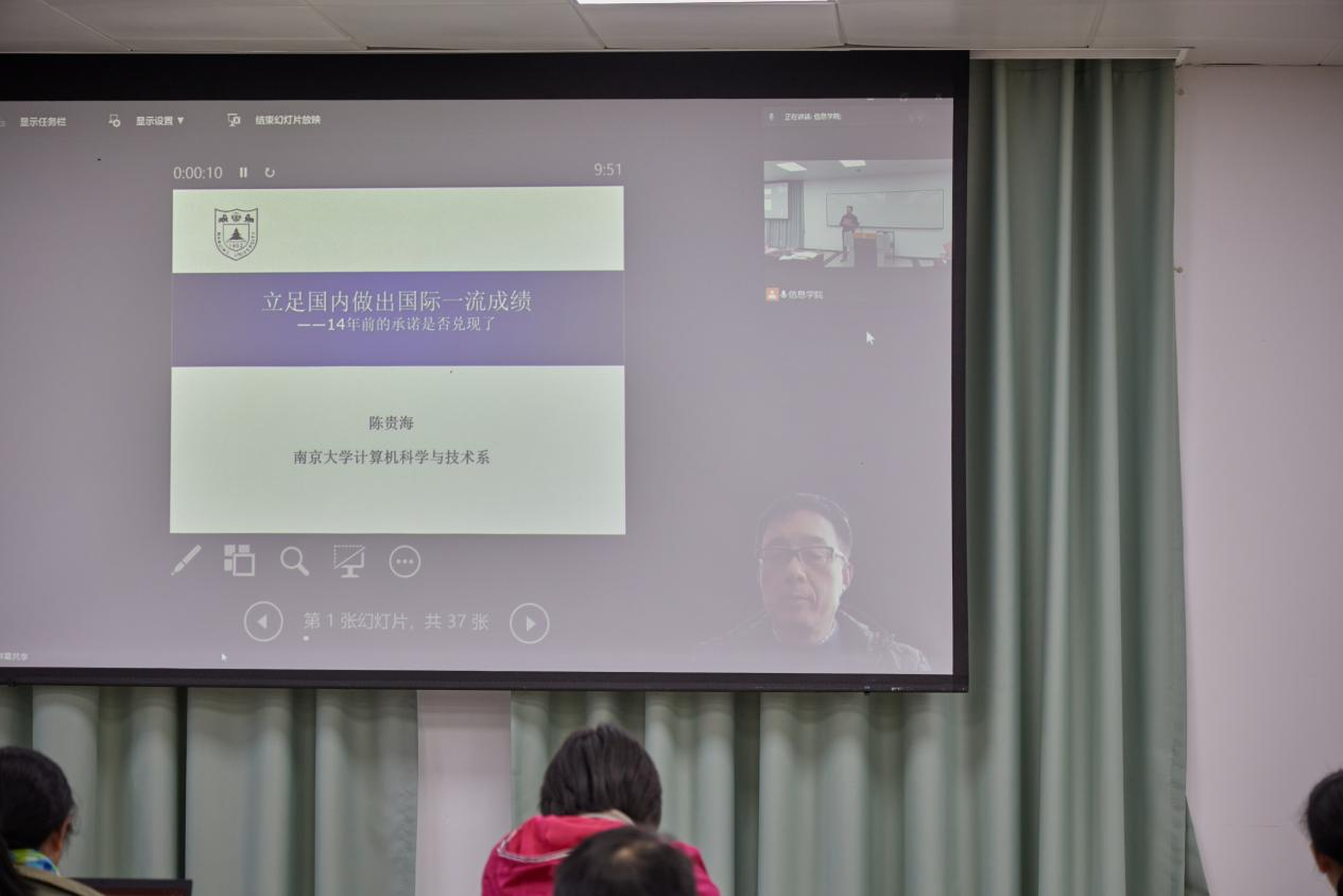 南京大学陈贵海教授作《立足国内,做出世界一流成绩》的报告。陈教授围绕“水平衡量指标、中外水平比较、差距原因分析、如何缩小差距”等四方面内容开展报告,客观分析了中外高校间的区别,创新性地提出了南京大学的特色做法,进一步凸显了优秀团队文化建设对研究生培养工作的重要意义。