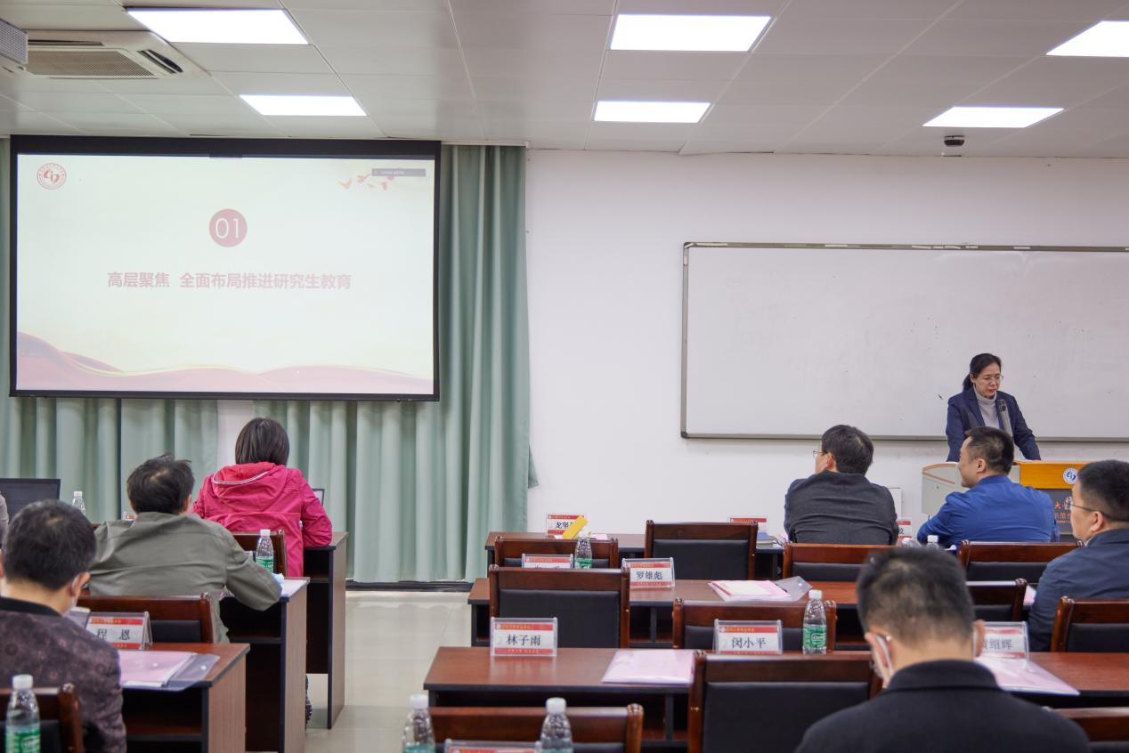 学院党委龙坚毅副书记以《立德树人,协同并举,加快推进研究生教育工作》为题向大会作报告。报告明确了新时代下学院研究生教育工作的时代内涵和深远意义,强调高校导师要胸怀“国之大者”,始终牢记立德树人的根本要求。她还从全员育人的力度、全过程育人的梯度、全方位育人的广度等三个维度上介绍了近年来学院育人成果和研究生培养的基本情况。
