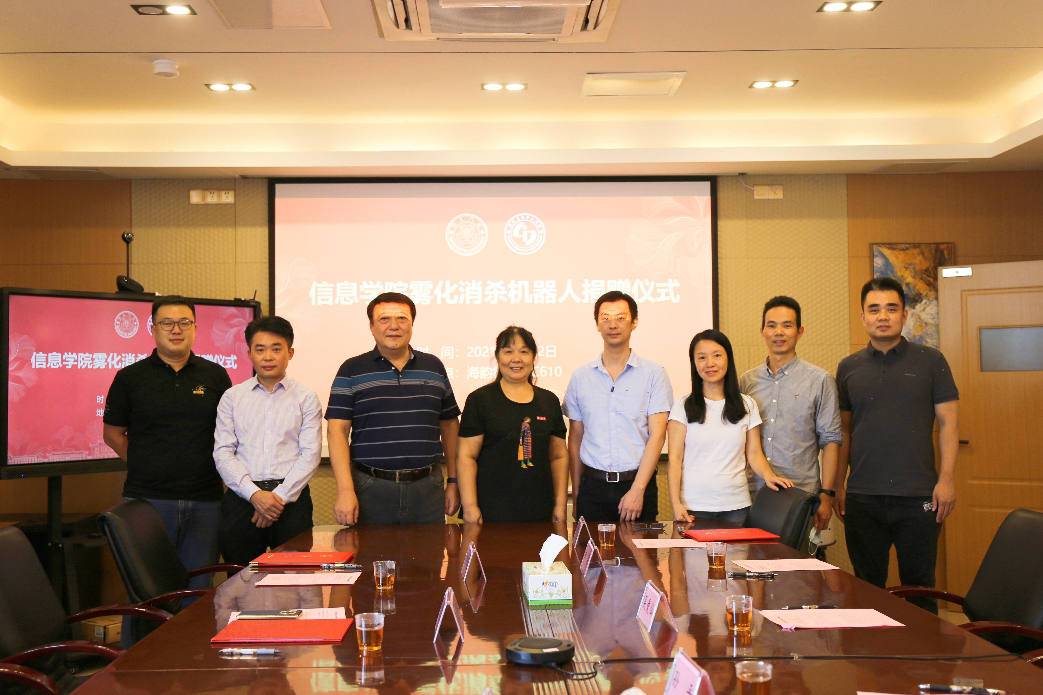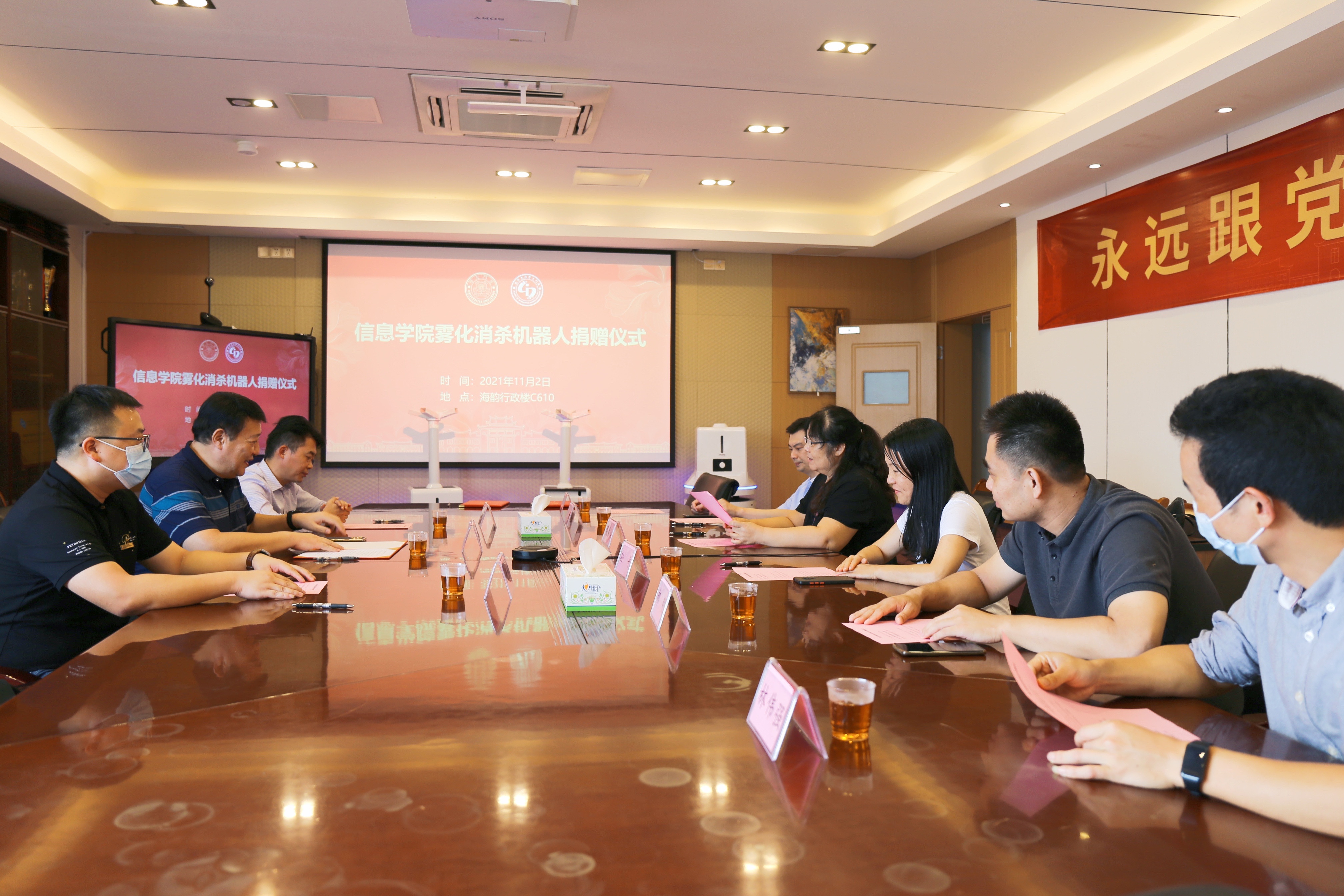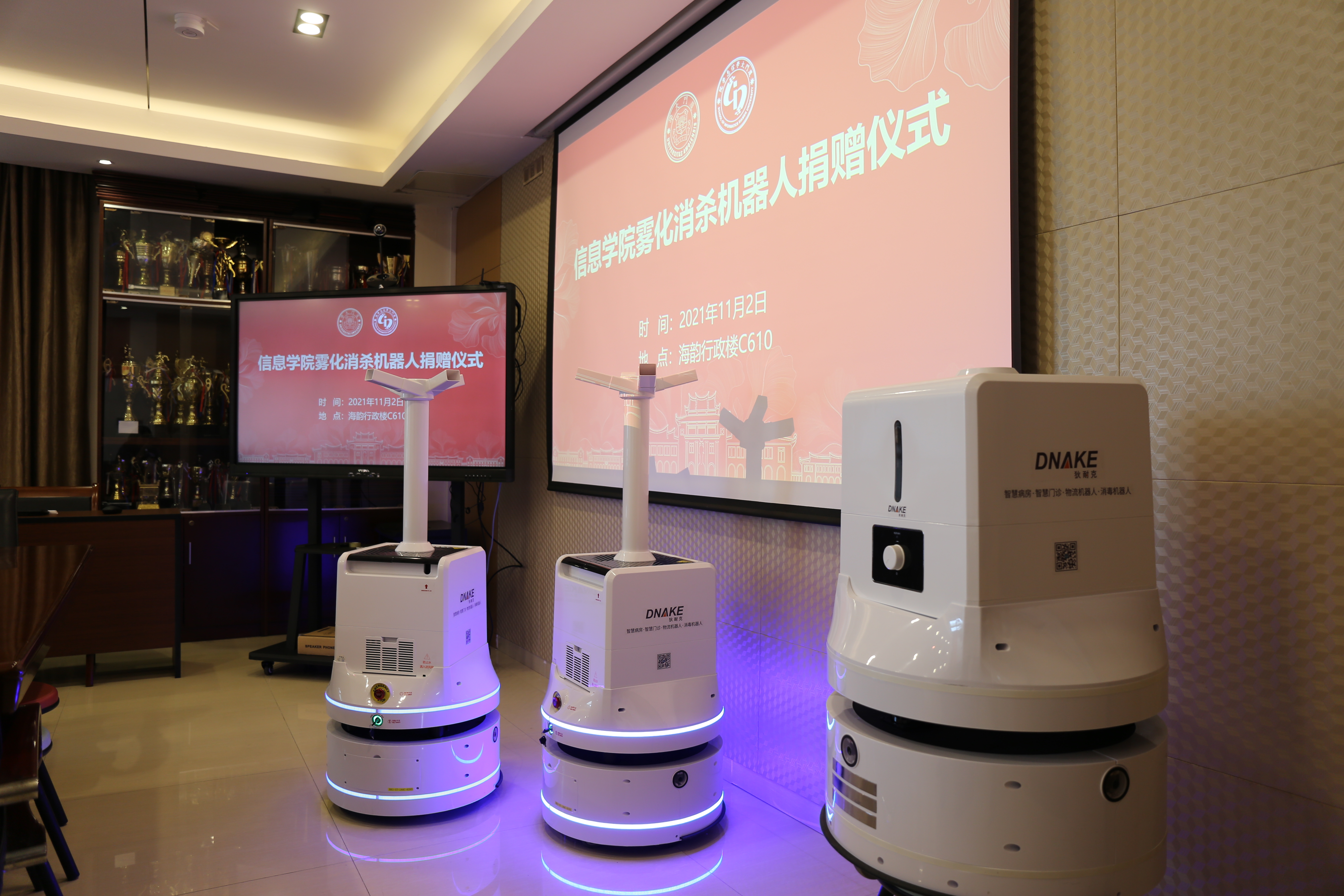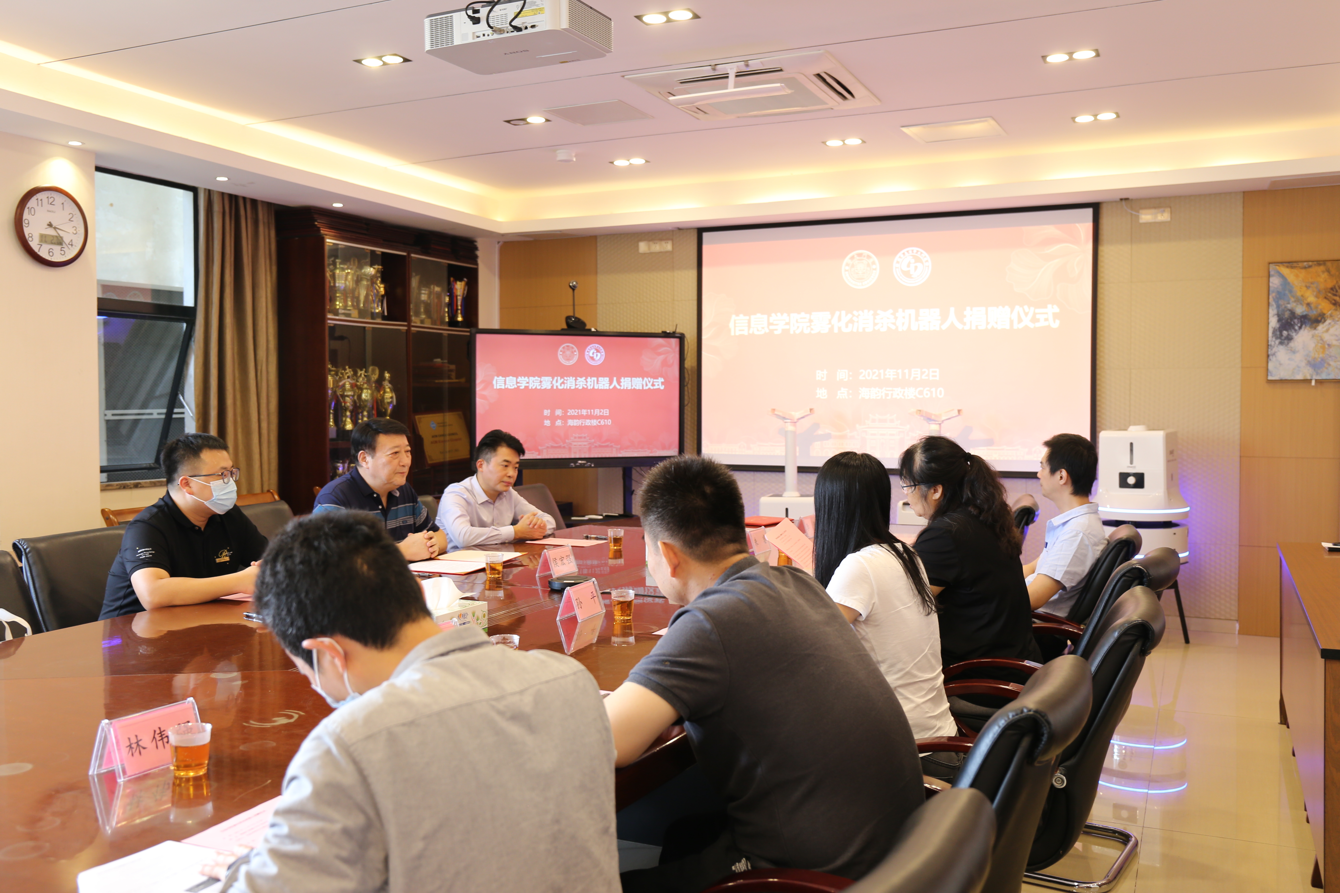 2021年11月2日下午,信息学院在行政楼C610会议室举行厦门狄耐克智能科技股份有限公司向学院捐赠雾化消杀机器人仪式。狄耐克公司副总经理侯宏强先生、人力行政总监李保垒先生、企划部副经理余世杰先生,厦门大学资产与后勤事务管理处副处长朱睿,信息学院副院长吴爱仙、办公室主任孙平等参加了仪式。捐赠仪式由孙平主持。