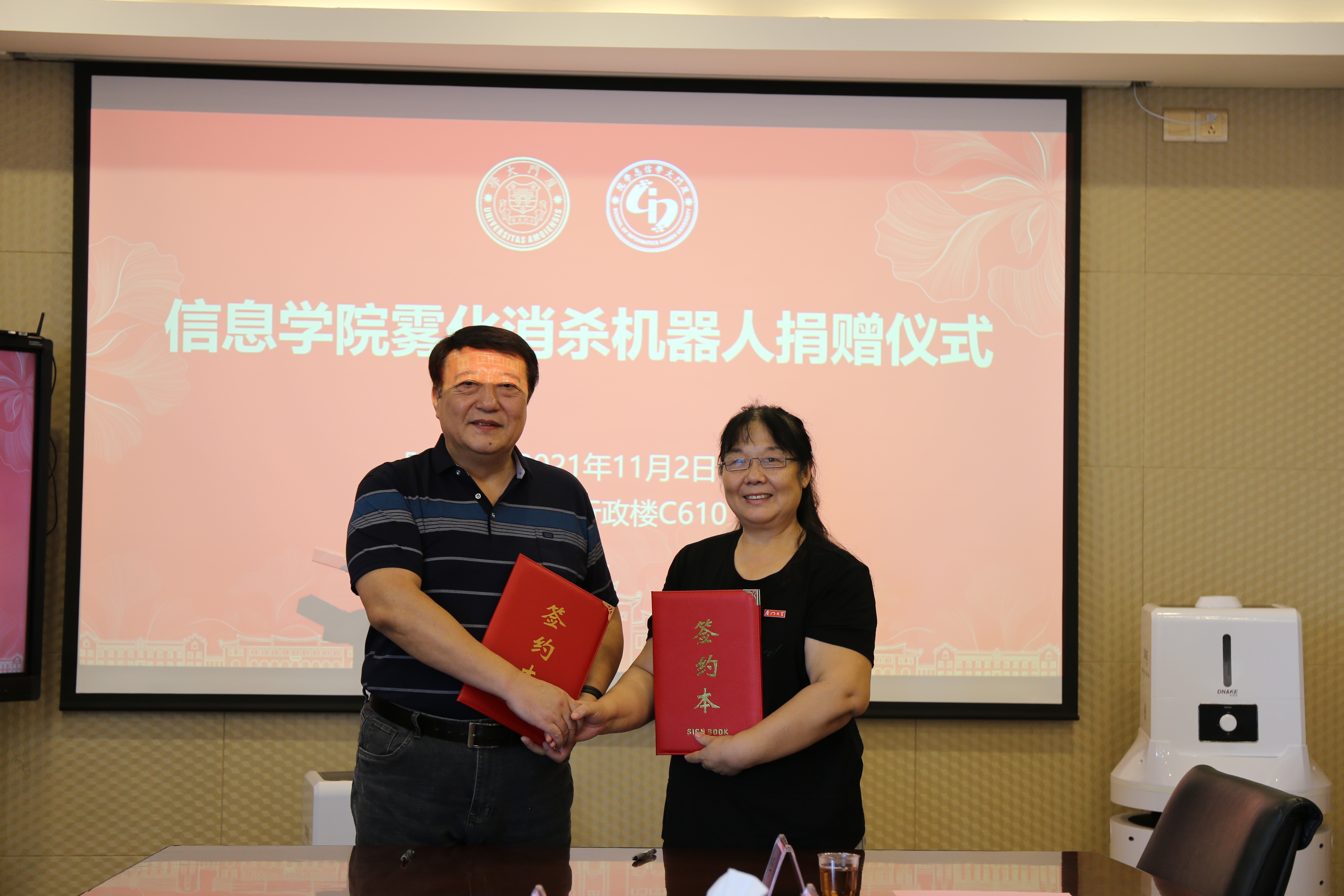 最后,侯宏强先生代表公司向学院捐赠3台总价值24万元的雾化消杀机器人,吴爱仙副院长代表学院接受捐赠。双方签订了捐赠协议。